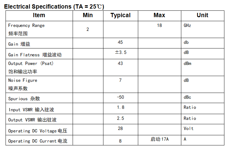 2GHz to 18GHz frequency coverage, broadband power amplifier 43 dBm, 45dB gain and SMA interface.