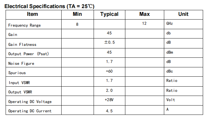 8GHz to 12GHz frequency coverage, broadband power amplifier 45dBm, 45dB gain and SMA interface